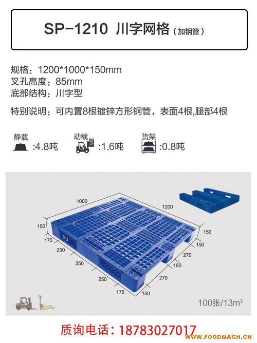 出售重慶塑料托盤,1210塑料托盤出廠價*大尺寸:1200L×1100W×140H mm重量:12.5kg動載:800kg靜載:3000kg每100塊托盤...