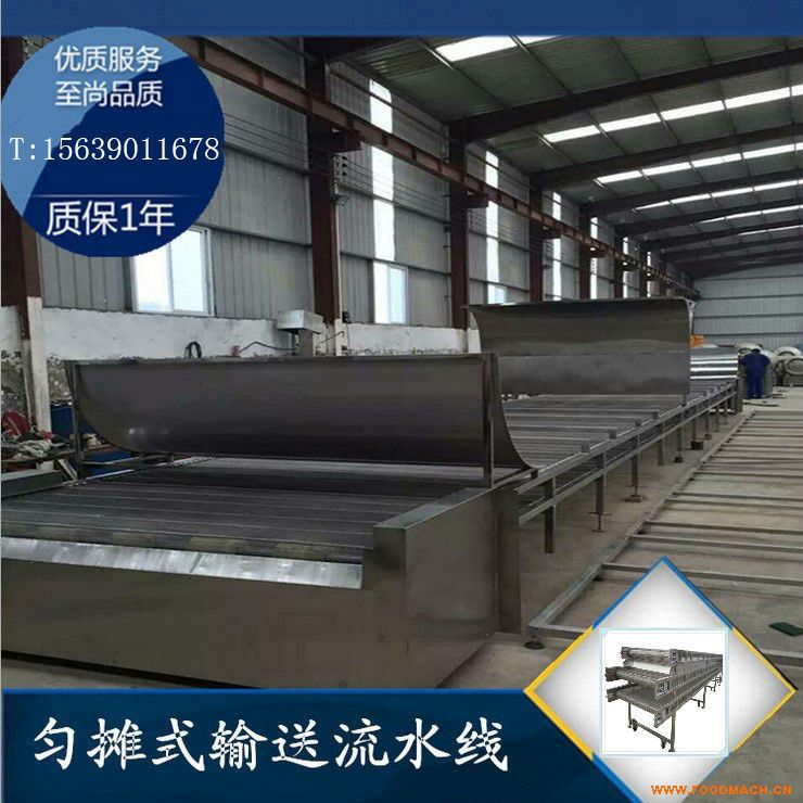 整機采用工業(yè)方管制作,由餃子輸送機,平板輸送帶,分散擺頭,速凍網(wǎng)帶和成品料倉組成,功率全部共計4kw左右,變頻調(diào)速,鏈條...