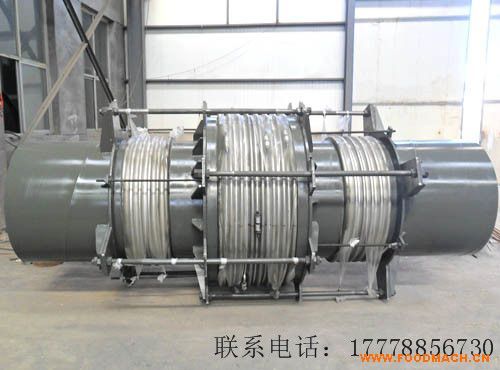 直管壓力平衡式波紋補償器又稱作直管壓力平衡型膨脹節(jié),補償器的兩端各有一個工作波紋管,中間有一個平衡波紋管,膨脹節(jié)通過受力構件(大拉桿或舌管)來承受內(nèi)壓推力。因此管系只需中間固定支架。此類膨脹節(jié)只能吸收軸向位移。