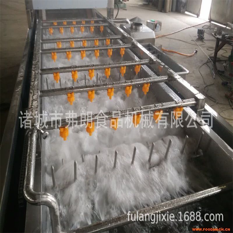 全自動肉類解凍線設(shè)備主要應(yīng)用于肉類,禽類,海鮮、水果、蛋品、水果的解凍。將凍肉(板、塊)等料放進(jìn)加滿水的解凍池,用高壓氣泡將水快速翻騰,讓產(chǎn)品在解凍池內(nèi)相互碰撞,相互摩擦,從而達(dá)到快速解凍的目的。解凍池旁邊有恒溫池,水從恒溫池流入解凍機(jī)入料口處,隨著凍品的化冰解凍,網(wǎng)鏈上的產(chǎn)品向出料方向出料,解凍池內(nèi)的水溫慢慢下降,到出料這段時(shí)間,水再從解凍池進(jìn)入到恒溫池,這樣循環(huán)利用,起到對水資源的節(jié)約,又能環(huán)保。既能降低成本,又能提高工作效率。