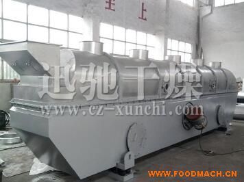 物料自進(jìn)料進(jìn)口進(jìn)入機(jī)內(nèi),在振動(dòng)力作用下,物料沿水平面流化床拋擲,向前連續(xù)運(yùn)動(dòng),熱風(fēng)向上穿過流化床同濕物料換熱后,濕空氣經(jīng)旋風(fēng)分離器除塵后由排風(fēng)1:3排出.干燥物料由排料進(jìn)口排出。