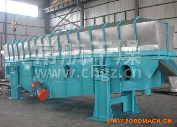 物料自進(jìn)料進(jìn)口進(jìn)入機(jī)內(nèi),在振動(dòng)力作用下,物料沿水平面流化床拋擲,向前連續(xù)運(yùn)動(dòng),熱風(fēng)向上穿過流化床同濕物料換熱后,濕空氣經(jīng)旋風(fēng)分離器除塵后由排風(fēng)1:3排出.干燥物料由排料進(jìn)口排出。