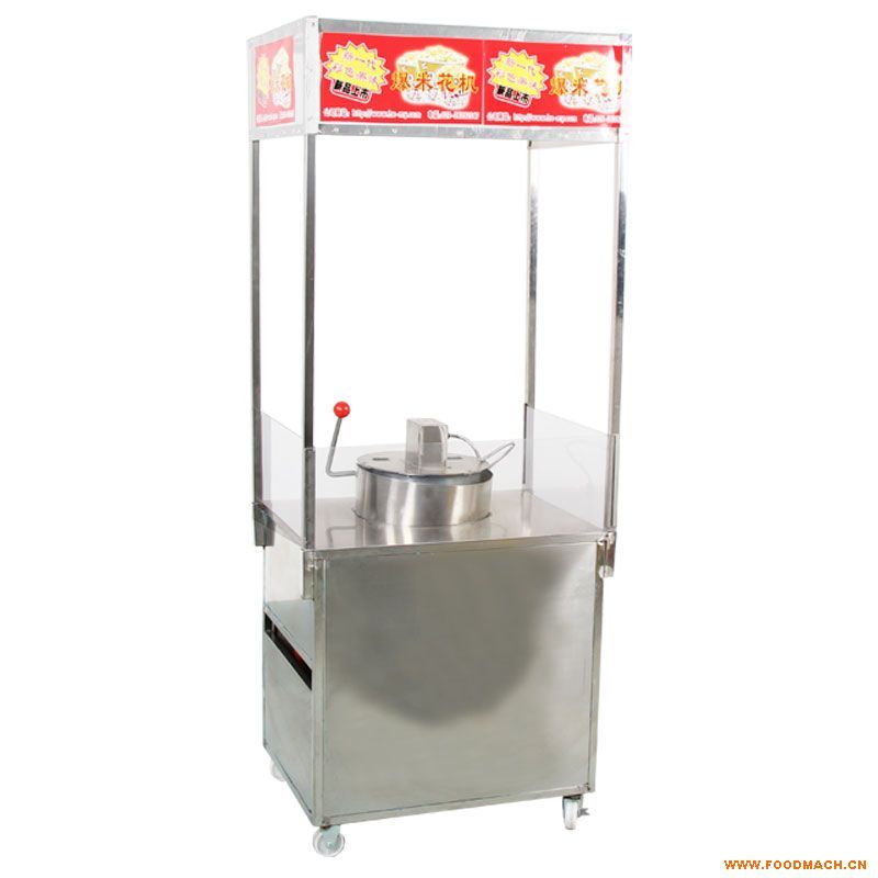 豪華型單鍋爆米花機,移動單鍋爆谷機 采用不銹板壓模成型,機身用不銹鋼加厚面板,以加固式構(gòu)造、堅固耐用,裝有支架,機身正面貼有鮮明的廣告;操作臺周圍設(shè)有防風(fēng)罩,外觀就像個鍵康時尚的專業(yè)爆米花小屋;