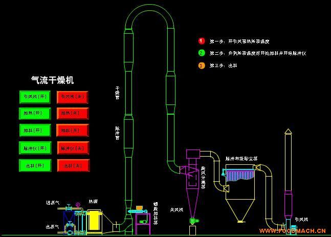 上述這類物料具有特殊性:比重輕,加料難,易燃,易爆。針對此情況,我公司技術部門開發(fā)研制的新型氣流干燥機,在原氣流干燥機的基礎上改進了加料形式,解決了“架橋”現(xiàn)象。創(chuàng)新改進了旋風分離器,解決了物料翻滾不出料的現(xiàn)象。系統(tǒng)集成,控制先進,超溫報警連鎖關閉熱源,有效解決了溫度過高引起的燃燒爆炸問題。