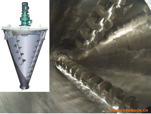 工作時(shí),裝在機(jī)內(nèi)的兩根螺旋作自轉(zhuǎn)的同時(shí)又沿錐壁作公轉(zhuǎn),呈行星式的運(yùn)動(dòng)。雙螺旋的快速自轉(zhuǎn)將物料向上提升,形成兩股非對稱的沿筒壁和中間自下向上的螺柱物料流。