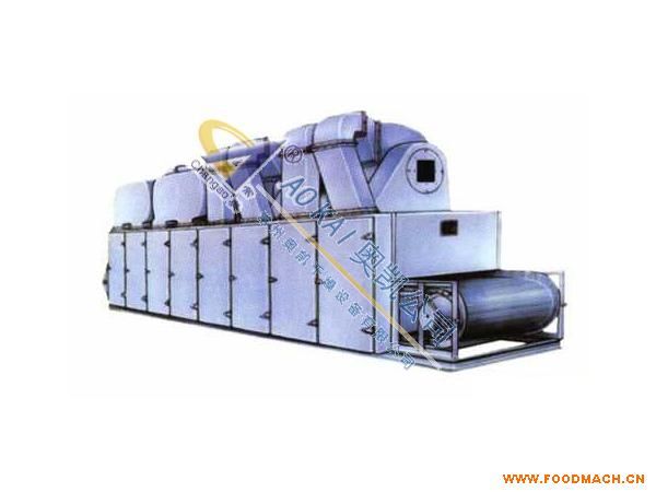 物料由加料器均勻地鋪在網(wǎng)帶上,網(wǎng)帶一般采用12-60目不銹鋼絲網(wǎng),由傳動(dòng)裝置拖動(dòng)在干燥機(jī)內(nèi)移動(dòng)。干燥機(jī)由若干單元組成,每一單元熱風(fēng)獨(dú)立循環(huán),部分尾氣由專門排濕風(fēng)機(jī)排出,廢氣由調(diào)節(jié)閥控制,熱氣由下往上或由上往下穿過(guò)鋪滿物料的網(wǎng)帶完成熱量與質(zhì)量傳遞的進(jìn)程,帶走物料水份。網(wǎng)帶緩慢移動(dòng),運(yùn)行速度可根據(jù)物料溫度自由調(diào)節(jié),干燥后的成品連續(xù)落入收料器中。上下循環(huán)單元根據(jù)用戶需要可靈活配備,單元數(shù)量亦可根據(jù)需要選取。