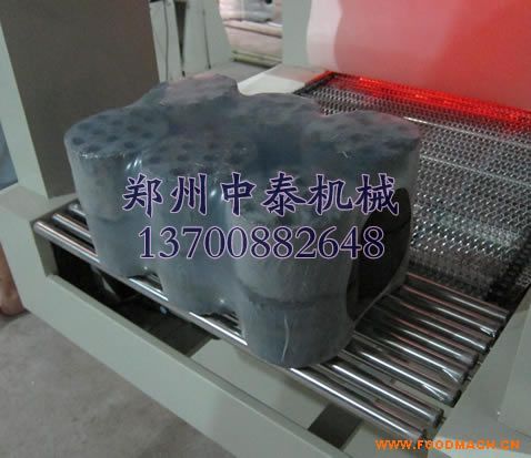 人工將蜂窩煤擺到工作臺上→按動啟動按鈕→機器自動裹膜封切→自動熱收縮包裝