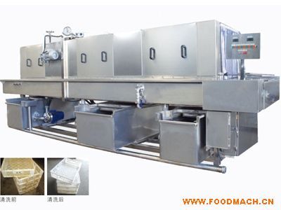 設(shè)備原理需清洗的周轉(zhuǎn)筐由不銹鋼鏈條輸入清洗機中,依次通過加溫老堿水→高壓熱水→常溫自來水→消毒水→常溫風刀去水等多道...