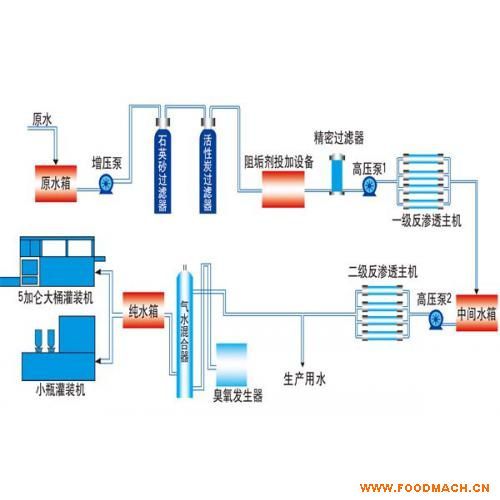 雙級反滲透中*級的產(chǎn)水作為原水進入第二級。并且有連續(xù)流量的濃水循環(huán),使用這種工藝,二級的出水完全達到國家純凈水標準,雙...