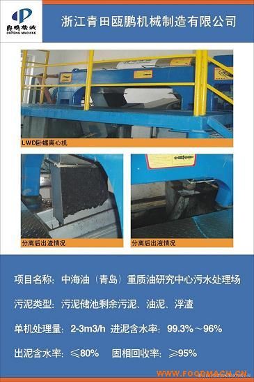 臥螺離心機(jī)用于中海油重質(zhì)油項(xiàng)目名稱:中海油(青島)重質(zhì)研究中心油污水處理廠污泥類型:污泥儲(chǔ)池乘余污泥、油泥、浮渣。單...