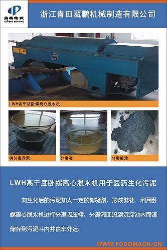 LWH高干度臥螺離心脫水機(jī)用于醫(yī)藥生化污泥向生化后的污泥加入一定的絮凝劑,形成繁華、利用臥螺離心脫水機(jī)進(jìn)行分離及壓榨,分...