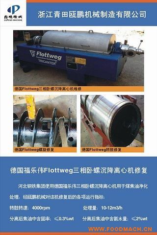 德國(guó)福樂偉Flottweg三相臥螺沉降離心機(jī)修復(fù)河北鋼鐵集團(tuán)使用德國(guó)福樂偉三相臥螺沉降離心機(jī)用于煤焦油凈化處理,經(jīng)甌鵬機(jī)械對(duì)...