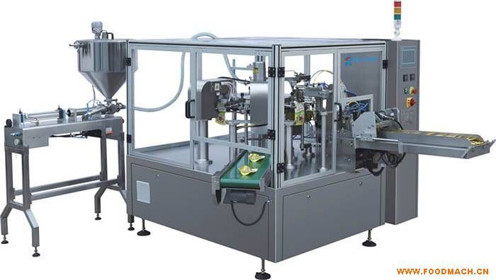 全自動(dòng)液醬體包裝機(jī)組由給袋式全自動(dòng)包裝機(jī)與液體、醬體灌裝機(jī)組成。