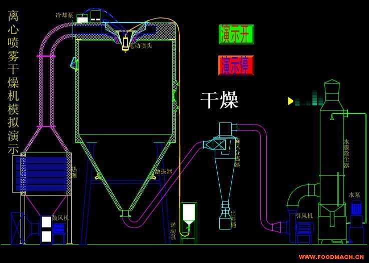 廠家生產(chǎn)玉米淀粉高速離心噴霧干燥機(jī),成品連續(xù)地由干燥塔底部和旋風(fēng)分離器中輸出,廢氣由風(fēng)機(jī)排空。