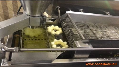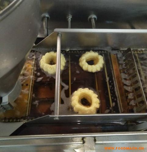 該機(jī)器采用“沉炸”的形式去炸波提圈,使得甜甜圈兩面色澤均勻。只需要將面團(tuán)倒進(jìn)料斗,無需手動(dòng)操作成型。