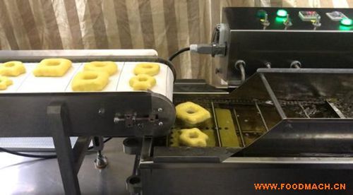 你只需要將發(fā)酵后的甜甜圈面團(tuán)放在輸送帶,它將自動(dòng)送到油炸爐里。占地面積小且安全。