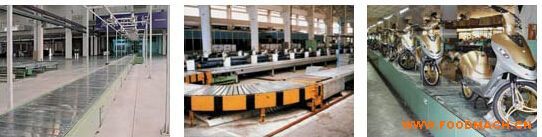 板鏈輸送機(jī)適用于形狀不規(guī)則物品的重載輸送。鏈條選用空心大輥?zhàn)訋Ц郊湕l,在兩側(cè)同步鏈條的附件上用板狀構(gòu)件連接使輸送方向形成連續(xù)的平板,因而運(yùn)行平穩(wěn)。該機(jī)與鏈?zhǔn)交蜉佂草斔蜋C(jī)配合使用可實(shí)現(xiàn)轉(zhuǎn)角輸送。