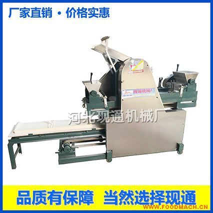 (5)    調(diào)試滾筒前先把調(diào)整滾筒的手柄調(diào)到*緊,做上記號(hào),同時(shí)松手柄,這樣厚薄就會(huì)一致。然后把和好的面絮放在進(jìn)料口,不要用手指向滾筒里推面,要用掌心,避免把手指壓近滾筒造成傷害,根據(jù)您的需要反復(fù)把面皮壓成形,再用木軸卷起來,然后放到機(jī)器的進(jìn)料口,把滾筒調(diào)試您需要的厚度,就可做出光滑的面皮,再經(jīng)過輸送帶傳送,打開粉箱離合器自動(dòng)撒上淀粉或面粉,有輸送帶把撒完粉的面皮自動(dòng)帶到折疊的機(jī)架上,由自動(dòng)折疊裝置自動(dòng)把面皮折疊起來。做餃子皮用模具扣,做餛飩皮用刀切,裝上面條刀可做出粗細(xì)不等的鮮面條。