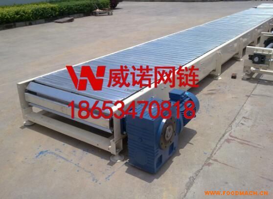 板鏈輸送機(jī)適用于形狀不規(guī)則物品的重載輸送。鏈條選用空心大輥?zhàn)訋Ц郊湕l,在兩側(cè)同步鏈條的附件上用板狀構(gòu)件連接使輸送方向形成連續(xù)的平板,因而運(yùn)行平穩(wěn)。該機(jī)與鏈?zhǔn)交蜉佂草斔蜋C(jī)配合使用可實(shí)現(xiàn)轉(zhuǎn)角輸送。