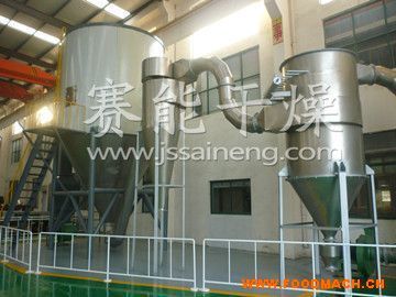 壓力噴霧干燥機是一種可以同時完成干燥和造粒的裝置。按工藝要求可以調節(jié)料液泵的壓力,流量,噴孔的大小,得到所需的按一定大小比例的球形顆粒。其工作過程為料液通過隔膜泵高壓輸入,噴出霧狀液滴,然后同熱空氣并流下降,大部分粉粒由塔底排料口收集,廢氣及其微小粉末經(jīng)旋風分離器分離,廢氣由抽風機排出,粉末由設在旋風分離器下端的授粉筒收集,風機出口處還可裝備二級除塵裝置,回收率在96-98%以上。其與物料接觸部分的塔體、管道、分離器的材料,均采用SUS304制作。在塔體內(nèi)部與外殼之間有足夠的保溫層,填充材料為超細玻璃棉,塔體設有觀察門、視鏡、光源及控制儀表,由電氣控制操作臺控制和顯示。其熱源裝置采用蒸汽加熱或電加熱器,具有操作方便、啟動快、結構緊湊、熱風干凈清潔等優(yōu)點。另外在電氣控制柜內(nèi)裝有電加熱器的控制調節(jié)裝置,使進口溫度無級調節(jié)。對于缺電地區(qū)可采用蒸汽加熱或燃煤、燃油熱風爐等方式,局部或全部代替電加熱裝置。