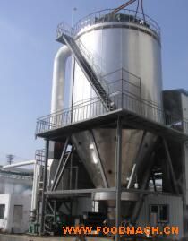 空氣經(jīng)過過濾和加熱,進入干燥器頂部空氣分配器,熱空氣呈螺旋狀均勻地進入干燥室。料液經(jīng)塔體頂部的高速離心霧化器,(旋轉)噴霧成極細微的霧狀液珠,與熱空氣并流接觸,在極短的時間內(nèi)可干燥為成品。成品連續(xù)地由干燥塔底部和旋風分離器中輸出,廢氣由風機排空。