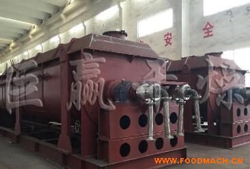 空心軸上密集排列著楔型中空漿葉,熱介質(zhì)經(jīng)空心軸流經(jīng)漿葉。單位有效容積內(nèi)傳熱面積很大,熱介質(zhì)溫度從-40℃到320℃,可以是水蒸汽,也可以是液體型:如熱水、導熱油等。間接傳導加熱,沒有攜帶空氣帶走熱量,熱量均用來加熱物料。熱量損失僅為通過器體保溫層向環(huán)境的散熱。楔型漿葉傳熱面具有自清潔功能。物料顆粒與楔型面的相對運動產(chǎn)生洗刷作用,能夠洗刷掉楔型面上附著物料,使運轉(zhuǎn)中一直保持著清潔的傳熱面。漿葉干燥機的殼體為Ω型,殼體內(nèi)一般安排二到四根空心攪拌軸。殼體有密封端蓋與上蓋,防止物料粉塵外泄而充分發(fā)揮作用。