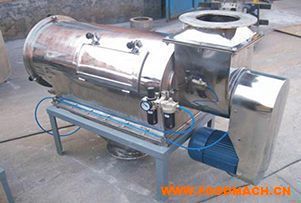 本設(shè)備篩網(wǎng)為圓筒狀,置于機(jī)體內(nèi),物料通過(guò)螺旋輸送系統(tǒng)后,和氣流混合,霧化進(jìn)入網(wǎng)筒內(nèi),通過(guò)網(wǎng)筒內(nèi)風(fēng)輪葉片使物料同時(shí)受離心力和旋風(fēng)推進(jìn)力,從而迫使物料噴射過(guò)網(wǎng),由細(xì)料排出口排出,不能過(guò)網(wǎng)的物料沿筒壁從粗料口排出。