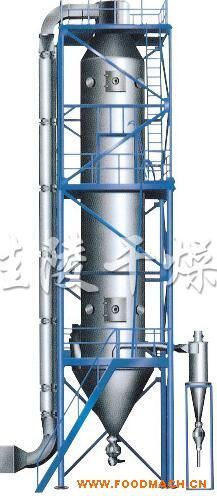 本機(jī)組工作過程為料液通過隔膜泵高壓輸入,噴出霧狀液滴,然后同熱空氣并流下降,大部分粉粒由塔底排料口收集,廢氣及其微小粉末經(jīng)旋風(fēng)分離器分離,廢氣由抽風(fēng)機(jī)排出,粉末由設(shè)在旋風(fēng)分離器下端的授粉筒收集,風(fēng)機(jī)出口還可裝備二級(jí)除塵裝置,回收率在96-98%以上。