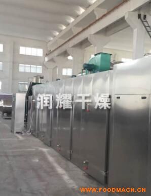 物料由加料器均勻地鋪在網(wǎng)帶上,網(wǎng)帶一般采用12-60目不銹鋼絲網(wǎng),由傳動(dòng)裝置拖動(dòng)在干燥機(jī)內(nèi)移動(dòng)。干燥機(jī)由若干單元組成,每一單元熱風(fēng)獨(dú)立循環(huán),部分尾氣由專門排濕風(fēng)機(jī)排出,廢氣由調(diào)節(jié)閥控制,熱氣由下往上或由上往下穿過鋪滿物料的網(wǎng)帶完成熱量與質(zhì)量傳遞的進(jìn)程,帶走物料水份。網(wǎng)帶緩慢移動(dòng),運(yùn)行速度可根據(jù)物料溫度自由調(diào)節(jié),干燥后的成品連續(xù)落入收料器中。上下循環(huán)單元根據(jù)用戶需要可靈活配備,單元數(shù)量亦可根據(jù)需要選取。