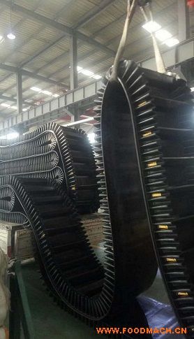 大傾角擋邊提升帶, 是由基帶、擋邊、橫隔板3部分組成。擋邊起防止物料測滑撒落的作用。為便于繞過滾筒,檔邊設(shè)計成波紋狀;橫隔板的作用是承托物料,為了實現(xiàn)大傾角輸送,采用T型TC型。檔邊和橫隔板是用二次硫化的方法與基帶連接的,具有很高的連接強度。用于輸送易散落的粉狀、粒狀、小塊狀、糊狀及液態(tài)狀物料。其特點:適用于傾角0°~90°散裝物料的輸送;具有使用范圍廣、占地面積小、無轉(zhuǎn)運點、減少土建投資、維護費用低、維修容易輸送量大連續(xù)化、高效率、大傾角運輸,操作安全,使用簡便,,運費低廉,并能縮短運輸距離,降低工程造價,節(jié)省人力物力等特點;解決了普通帶和花紋帶所不能達到的輸送角度;還可根據(jù)使用環(huán)境,設(shè)計成完整、獨立的輸送系統(tǒng),避免了間斷輸送和復(fù)雜輸送的提升系統(tǒng)?裳厮、傾斜、垂直和變角方向輸送各種散裝物料,從煤、礦石、沙子到化肥和糧食等。物料粒度不限,可從很小的粒度到400mm的大粒度,輸送量可從1立方米/小時到6000立方米/小時。