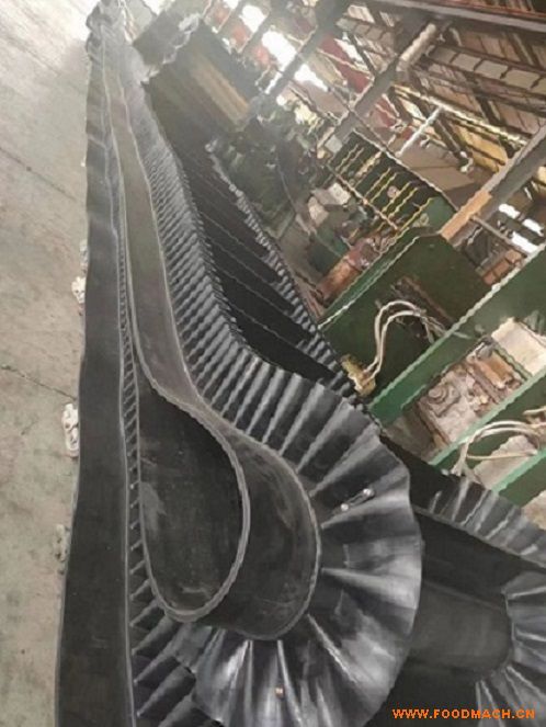 大傾角耐高溫波紋擋邊帶, 是由基帶、擋邊、橫隔板3部分組成。擋邊起防止物料測滑撒落的作用。為便于繞過滾筒,檔邊設(shè)計(jì)成波紋狀;橫隔板的作用是承托物料,為了實(shí)現(xiàn)大傾角輸送,采用T型TC型。檔邊和橫隔板是用二次硫化的方法與基帶連接的,具有很高的連接強(qiáng)度。用于輸送易散落的粉狀、粒狀、小塊狀、糊狀及液態(tài)狀物料。其特點(diǎn):適用于傾角0°~90°散裝物料的輸送;具有使用范圍廣、占地面積小、無轉(zhuǎn)運(yùn)點(diǎn)、減少土建投資、維護(hù)費(fèi)用低、維修容易輸送量大連續(xù)化、高效率、大傾角運(yùn)輸,操作安全,使用簡便,,運(yùn)費(fèi)低廉,并能縮短運(yùn)輸距離,降低工程造價(jià),節(jié)省人力物力等特點(diǎn);解決了普通帶和花紋帶所不能達(dá)到的輸送角度;還可根據(jù)使用環(huán)境,設(shè)計(jì)成完整、獨(dú)立的輸送系統(tǒng),避免了間斷輸送和復(fù)雜輸送的提升系統(tǒng)?裳厮健A斜、垂直和變角方向輸送各種散裝物料,從煤、礦石、沙子到化肥和糧食等。物料粒度不限,可從很小的粒度到400mm的大粒度,輸送量可從1立方米/小時(shí)到6000立方米/小時(shí)。