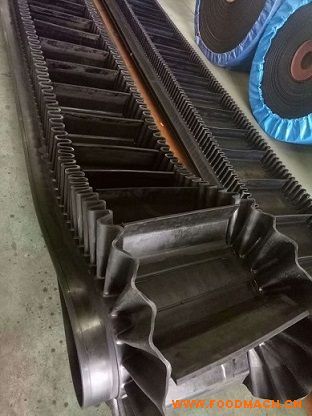 裙邊大傾角擋邊帶, 是由基帶、擋邊、橫隔板3部分組成。擋邊起防止物料測滑撒落的作用。為便于繞過滾筒,檔邊設計成波紋狀;橫隔板的作用是承托物料,為了實現(xiàn)大傾角輸送,采用T型TC型。檔邊和橫隔板是用二次硫化的方法與基帶連接的,具有很高的連接強度。用于輸送易散落的粉狀、粒狀、小塊狀、糊狀及液態(tài)狀物料。其特點:適用于傾角0°~90°散裝物料的輸送;具有使用范圍廣、占地面積小、無轉運點、減少土建投資、維護費用低、維修容易輸送量大連續(xù)化、高效率、大傾角運輸,操作安全,使用簡便,,運費低廉,并能縮短運輸距離,降低工程造價,節(jié)省人力物力等特點;解決了普通帶和花紋帶所不能達到的輸送角度;還可根據(jù)使用環(huán)境,設計成完整、獨立的輸送系統(tǒng),避免了間斷輸送和復雜輸送的提升系統(tǒng)。可沿水平、傾斜、垂直和變角方向輸送各種散裝物料,從煤、礦石、沙子到化肥和糧食等。物料粒度不限,可從很小的粒度到400mm的大粒度,輸送量可從1立方米/小時到6000立方米/小時。