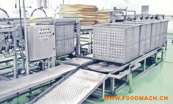 殺菌后的殺菌筐也由小車?yán)列犊鸬闹避壍,再進(jìn)入卸筐區(qū),卸框系統(tǒng)通電后啟動(dòng)油泵、網(wǎng)帶,切換到自動(dòng)控制,液壓系統(tǒng)自動(dòng)降到*低后(光電檢測)觸發(fā)指示燈自動(dòng)點(diǎn)亮。進(jìn)入待機(jī)狀態(tài),滿框推到位后按一下觸發(fā)按鈕,液壓系統(tǒng)自動(dòng)上升到合適高度(光電檢測)時(shí)推罐氣缸自動(dòng)啟動(dòng)把整層的罐頭推送到網(wǎng)帶上當(dāng)罐頭完全推出殺菌框后推罐氣缸自動(dòng)復(fù)位(光電檢測)后觸發(fā)指示燈自動(dòng)再次點(diǎn)亮,這時(shí)由人工取掉夾層板后再按觸發(fā)按鈕開始下次的卸框,以此循環(huán)。直至卸完整框罐頭為止。卸完罐頭的殺菌筐退出后,經(jīng)廻轉(zhuǎn)裝置、過橋又進(jìn)入裝筐區(qū)。