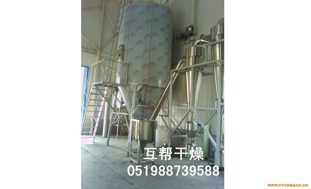 空氣經(jīng)過(guò)過(guò)濾和加熱,進(jìn)入干燥器頂部空氣分配器,熱空氣呈螺旋狀均勻地進(jìn)入干燥室。料液經(jīng)塔體頂部的高速離心霧化器,(旋轉(zhuǎn))噴霧成極細(xì)微的霧狀液珠,與熱空氣并流接觸,在極短的時(shí)間內(nèi)可干燥為成品。成品連續(xù)地由干燥塔底部和旋風(fēng)分離器中輸出,廢氣由風(fēng)機(jī)排空。