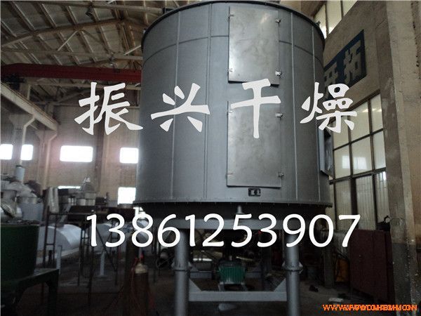 濕物料自加料器連續(xù)地加到干燥器上部*層干燥盤上,帶有耙葉的耙臂作回轉(zhuǎn)運(yùn)動(dòng)使耙臂作回轉(zhuǎn)運(yùn)動(dòng)使耙葉連續(xù)地翻抄物料。物料沿指數(shù)螺旋線流過干燥盤表面,在小干燥盤上的物料被移送到外緣,并在外緣落到下方的大干燥盤外緣,在大干盤上物料向里移動(dòng)并從中間落料口落如下一層小干燥盤中。大小干燥盤上下交替排列,物料得以連續(xù)地流過整個(gè)干燥器。中空的干燥盤內(nèi)通入加熱介質(zhì),加熱介質(zhì)形式有飽和蒸汽、熱水和導(dǎo)熱油,加熱介質(zhì)由干燥盤的一端進(jìn)入,從另一端導(dǎo)出。已干物料從*后一層干燥盤落到殼體的底層,*后被耙葉移送到出料口排出。濕份從物料中逸出,由設(shè)在頂蓋上的排濕口排出,真空型盤式干燥器的濕氣由設(shè)在頂蓋上的真空泵口排出。從底層排出的干物料可直接包裝。通過配加翅片加熱器、溶劑回收冷凝器、袋式除塵器、干料返混機(jī)構(gòu)、引風(fēng)機(jī)等輔機(jī),可提高其干燥的生產(chǎn)能力,干燥膏糊狀和熱敏性物