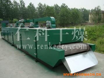 物料由加料器均勻地鋪在網(wǎng)帶上,網(wǎng)帶一般采用12-60目不銹鋼絲網(wǎng),由傳動裝置拖動在干燥機內(nèi)移動。干燥機由若干單元組成,每一單元熱風獨立循環(huán),部分尾氣由專門排濕風機排出,廢氣由調(diào)節(jié)閥控制,熱氣由下往上或由上往下穿過鋪滿物料的網(wǎng)帶完成熱量與質(zhì)量傳遞的進程,帶走物料水份。網(wǎng)帶緩慢移動,運行速度可根據(jù)物料溫度自由調(diào)節(jié),干燥后的成品連續(xù)落入收料器中。上下循環(huán)單元根據(jù)用戶需要可靈活配備,單元數(shù)量亦可根據(jù)需要選取。