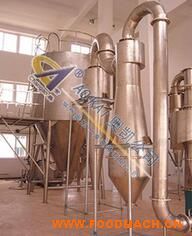 空氣經(jīng)過(guò)濾和加熱,進(jìn)入干燥器頂部空氣分配器,熱空氣呈螺旋狀均勻地進(jìn)入干燥室。料液經(jīng)塔體頂部的高速離心霧化器,(旋轉(zhuǎn))噴霧成極細(xì)微的霧狀液珠,與熱空氣并流接觸在極短的時(shí)間內(nèi)可干燥為成品。成品連續(xù)地由干燥塔底部和旋風(fēng)分離器中輸出,廢氣由風(fēng)機(jī)排空。
