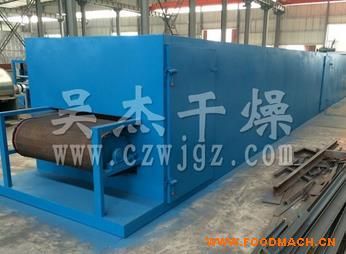 物料由加料器均勻地鋪在網(wǎng)帶上,網(wǎng)帶一般采用12-60目不銹鋼絲網(wǎng),由傳動(dòng)裝置拖動(dòng)在干燥機(jī)內(nèi)移動(dòng)。干燥機(jī)由若干單元組成,每一單元熱風(fēng)獨(dú)立循環(huán),部分尾氣由專門排濕風(fēng)機(jī)排出,廢氣由調(diào)節(jié)閥控制,熱氣由下往上或由上往下穿過鋪滿物料的網(wǎng)帶完成熱量與質(zhì)量傳遞的進(jìn)程,帶走物料水份。網(wǎng)帶緩慢移動(dòng),運(yùn)行速度可根據(jù)物料溫度自由調(diào)節(jié),干燥后的成品連續(xù)落入收料器中。上下循環(huán)單元根據(jù)用戶需要可靈活配備,單元數(shù)量亦可根據(jù)需要選取。